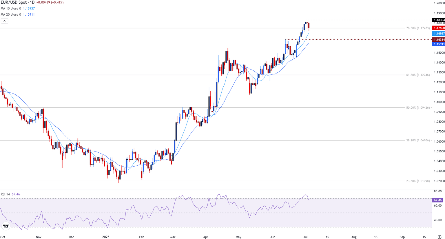 Despite this retracement, the price remains above both the 10-day and 20-day Simple Moving Average (SMA), currently providing support around 1.1695 and 1.1592, respectively. Both averages are trending upward, reflecting continued short- and medium-term strength and reinforcing the broader bullish structure.