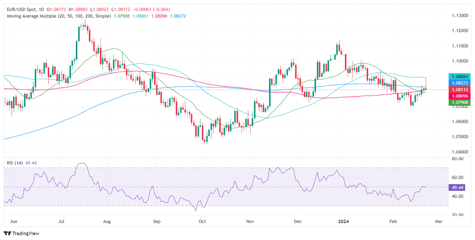 - EUR/USD falls to 1.0811, reversing gains after ECB minutes show reluctance to discuss rate cuts.