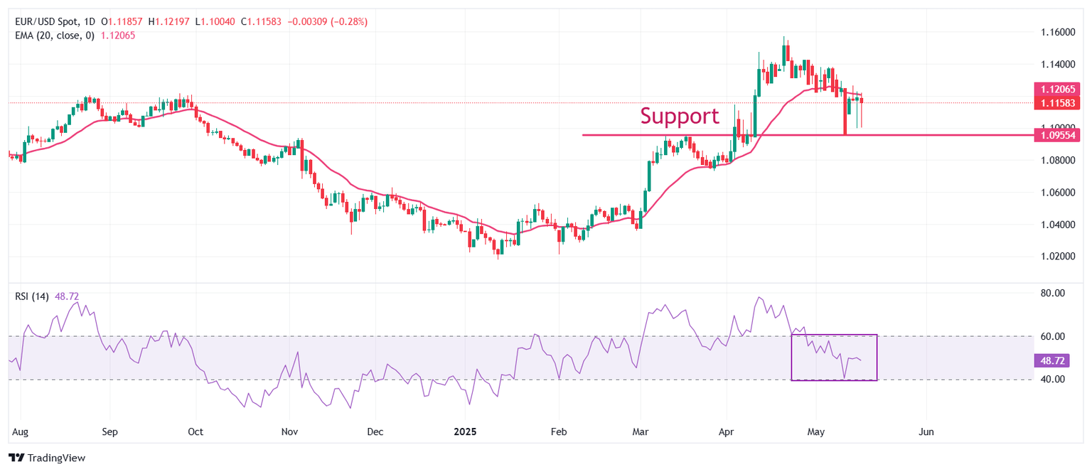 EUR/USD falls to near 1.1150 on Friday. The near-term outlook of the pair is still uncertain as the 20-day Exponential Moving Average (EMA) is acting as a key barrier around 1.1210.