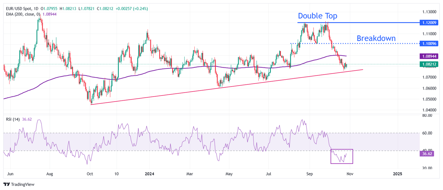 EUR/USD continues to hold above the upward-sloping trendline near 1.0750, which is plotted from the October 3, 2023, low at around 1.0450 on the daily time frame. However, the outlook of the major currency pair remains downbeat as it stays below the 200-day Exponential Moving Average (EMA), which trades around 1.0900.