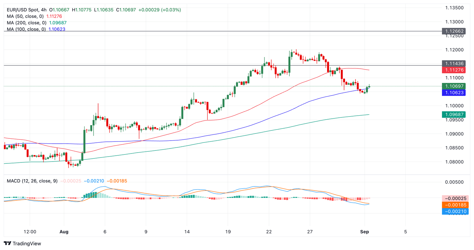 EUR/USD edges higher as traders continue to evaluate the future path of interest rates in the US. The probability that the Fed could cut the fed funds rate by 0.50% – to a range between 4.75% and 5.00% – at their September 18 meeting remains above 30% whilst the chances of a 0.25% reduction is fully priced in, according to the CME FedWatch Tool. The still fairly high chance of a 0.50% “mega cut” remains a headwind for the Greenback and supports EUR/USD.