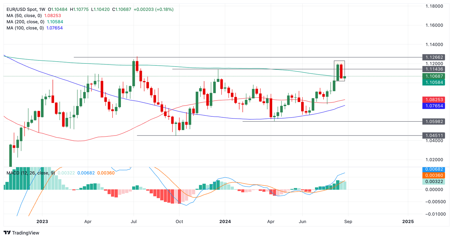EUR/USD trades marginally higher in the 1.1060s on Monday, as the Euro (EUR) strengthens against the US Dollar (USD) on the back of still-high probabilities the Federal Reserve (Fed) could implement a sharp cut in interest rates at their September meeting. This, in turn, weighs on the USD because lower interest rates make it less attractive to foreign investors, lowering capital inflows.