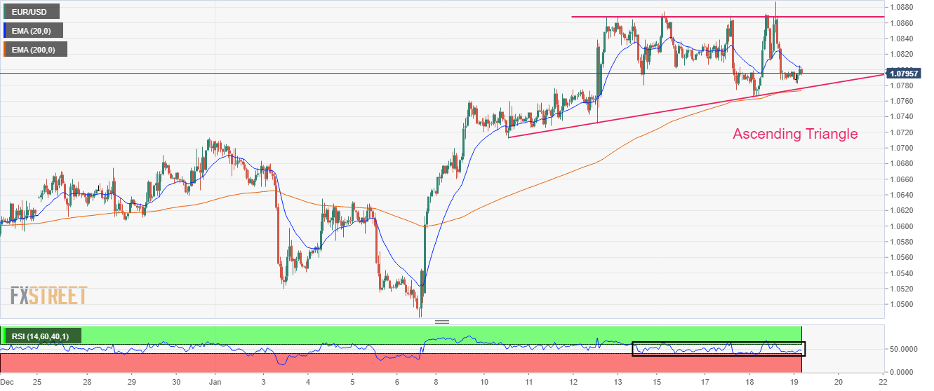 EUR/USD is looking to find support around the upward-sloping trendline of the Ascending Triangle chart pattern plotted from January 10 low at 1.0712 on an hourly scale. The horizontal resistance of the aforementioned chart pattern is placed from January 12 high at 1.0867.