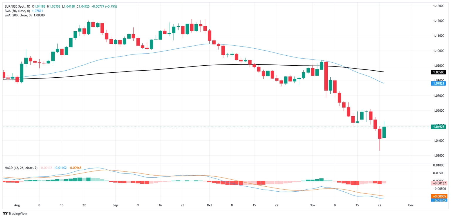 EUR/USD scrambled for higher ground on Monday, clipping back into the 1.0500 handle amid a broad-market relaxing of Greenback bidding as investors step back into a risk-on mood, albeit with limited impact. Overall market flows are set to be crimped this week with the back half of the week’s US market sessions hobbled by the impending US Thanksgiving holiday on Thursday and limited market hours on Friday.