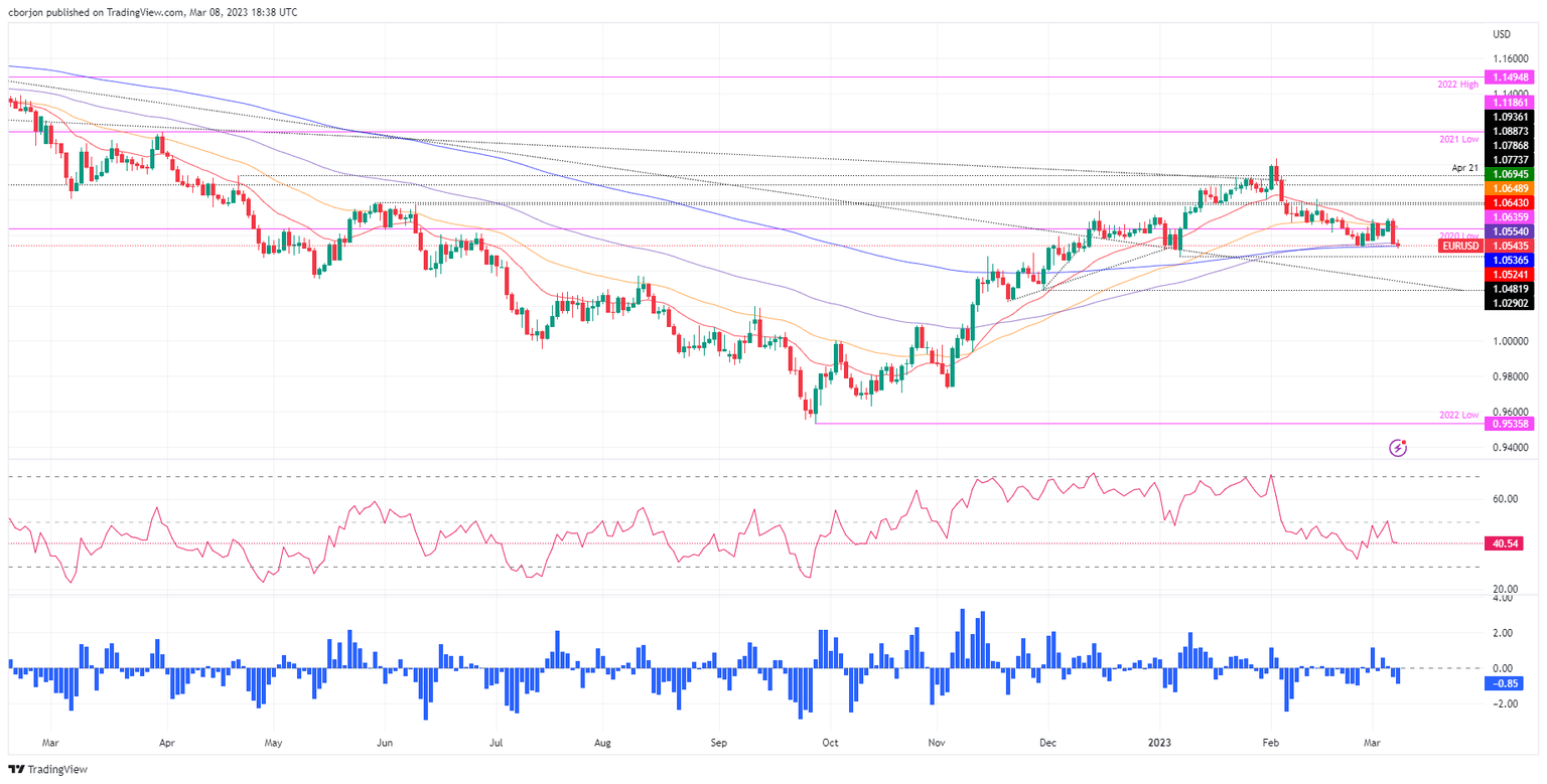 EUR/USD remains unchanged at 1.0545, below the 200-day Exponential Moving Average (EMA) as Fed Chair Jerome Powell testifies before the US Congress. Meanwhile, US equities continued to fluctuate, portraying a mixed sentiment, while the US Dollar turned positive. At the time of writing, the EUR/USD is trading at 1.0545.