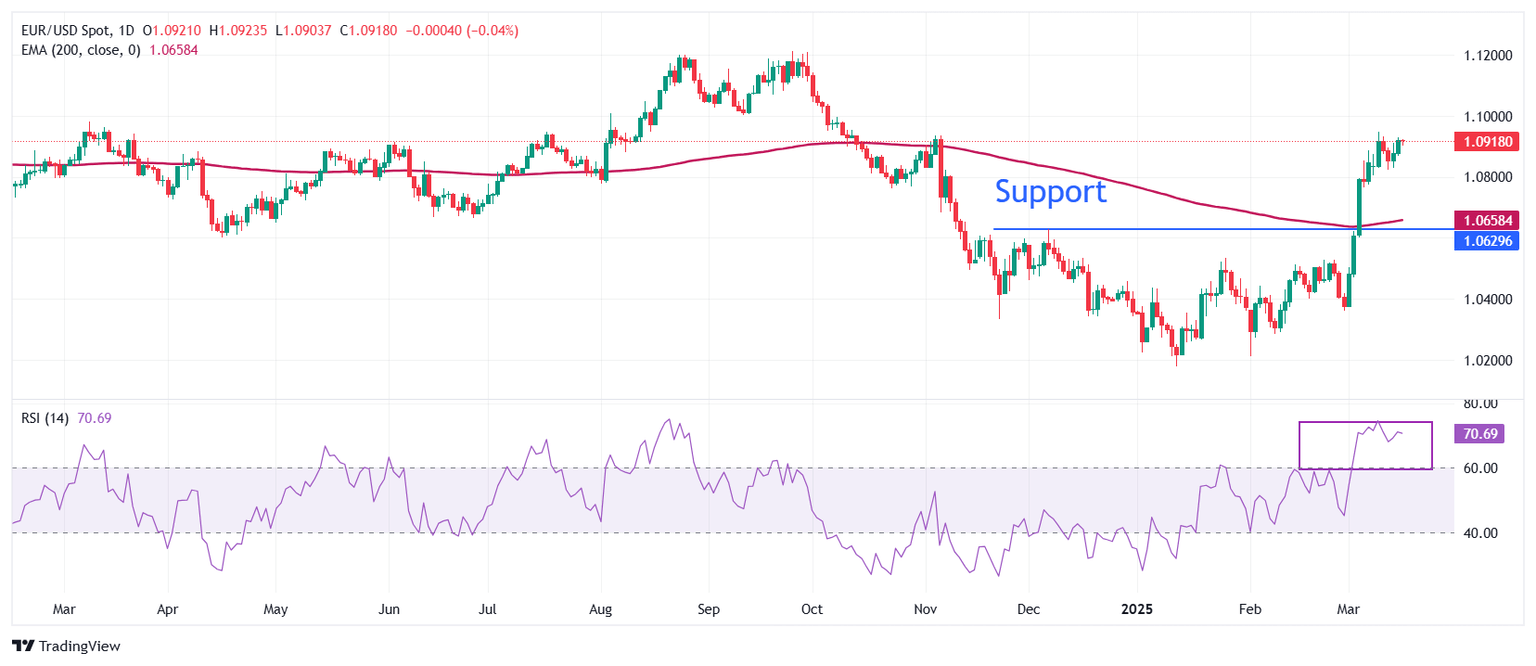 EUR/USD struggles to extend its upside above 1.0950 on Tuesday. The long-term outlook of the major currency pair remains firm as it holds above the 200-day Exponential Moving Average (EMA), which trades around 1.0655.