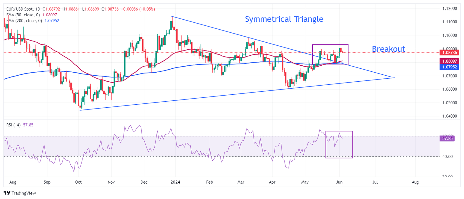 EUR/USD hovers around 1.0880 ahead of crucial US economic data. The major currency pair trades inside Tuesday’s trading range. The near-term outlook of the pair remains firm due to the Symmetrical Triangle breakout on a daily timeframe and upward-sloping 50-day Exponential Moving Average (EMA), which trades around 1.0800.