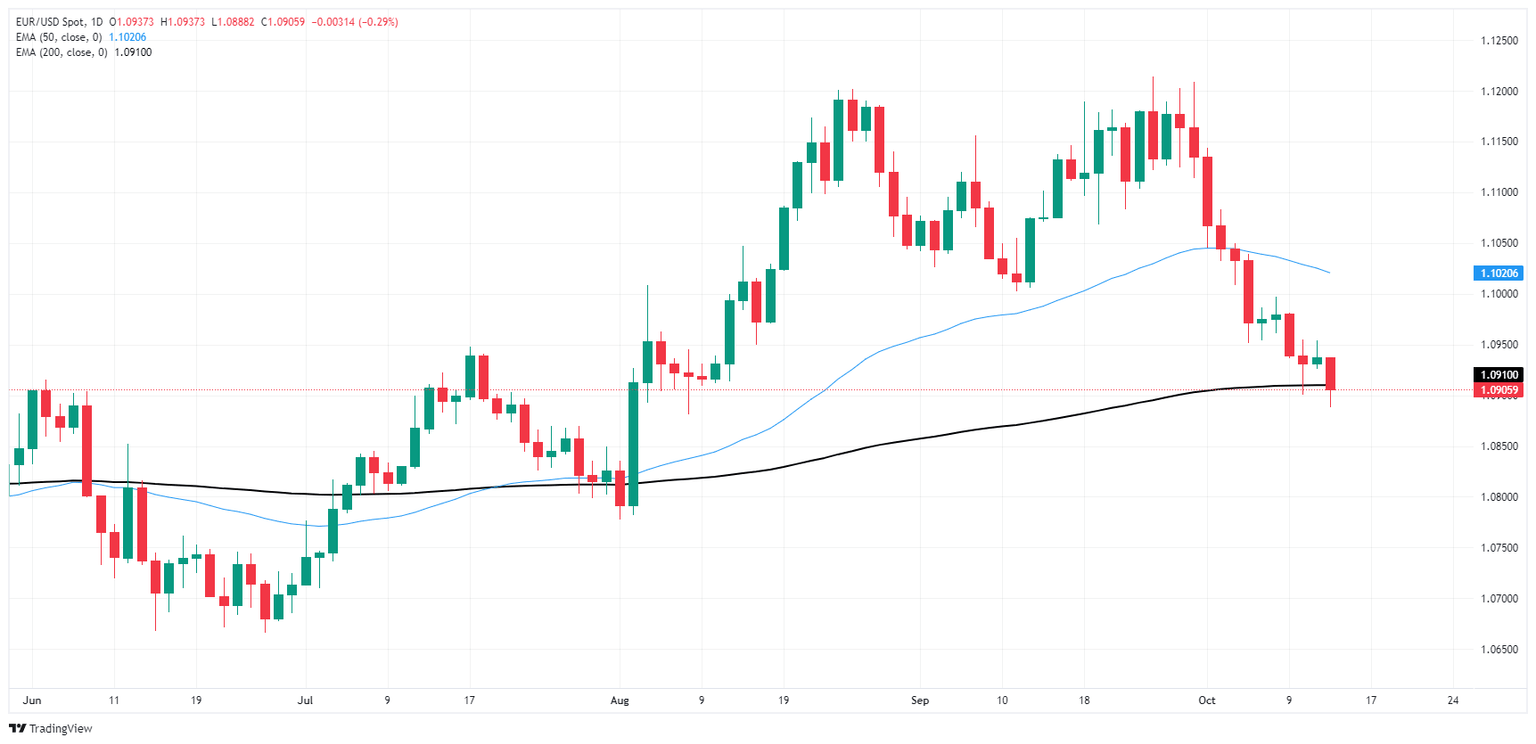 EUR/USD is succumbing to clear bearish pressure, with the pair falling into the 200-day EMA and backsliding into the 1.0900 handle at the same time. The Fiber has tumbled nearly 3% top-to-bottom from late September’s peaks just above 1.1200, and the pair has closed in the red for all but four of the last 13 straight trading days.