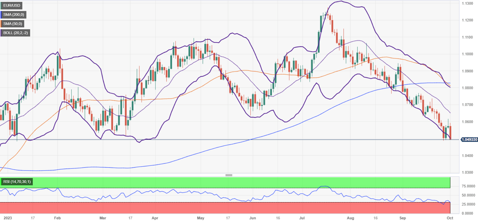 - EUR/USD drops to 1.0500, down 0.69%, as rising US Treasury bond yields and expectations of additional Fed tightening weigh heavily on the pair.