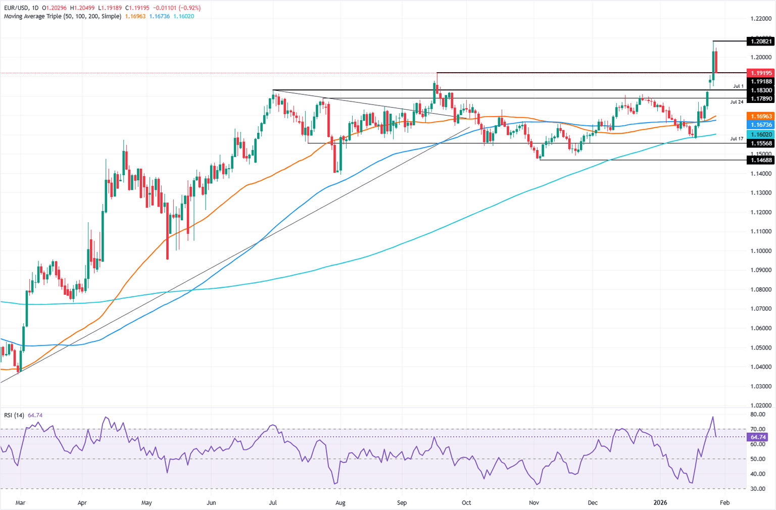 - ECB Vice President Luis de Guindos said last summer that an EUR/USD exchange rate around 1.20 would be acceptable, but warned that levels above that threshold could pose challenges.