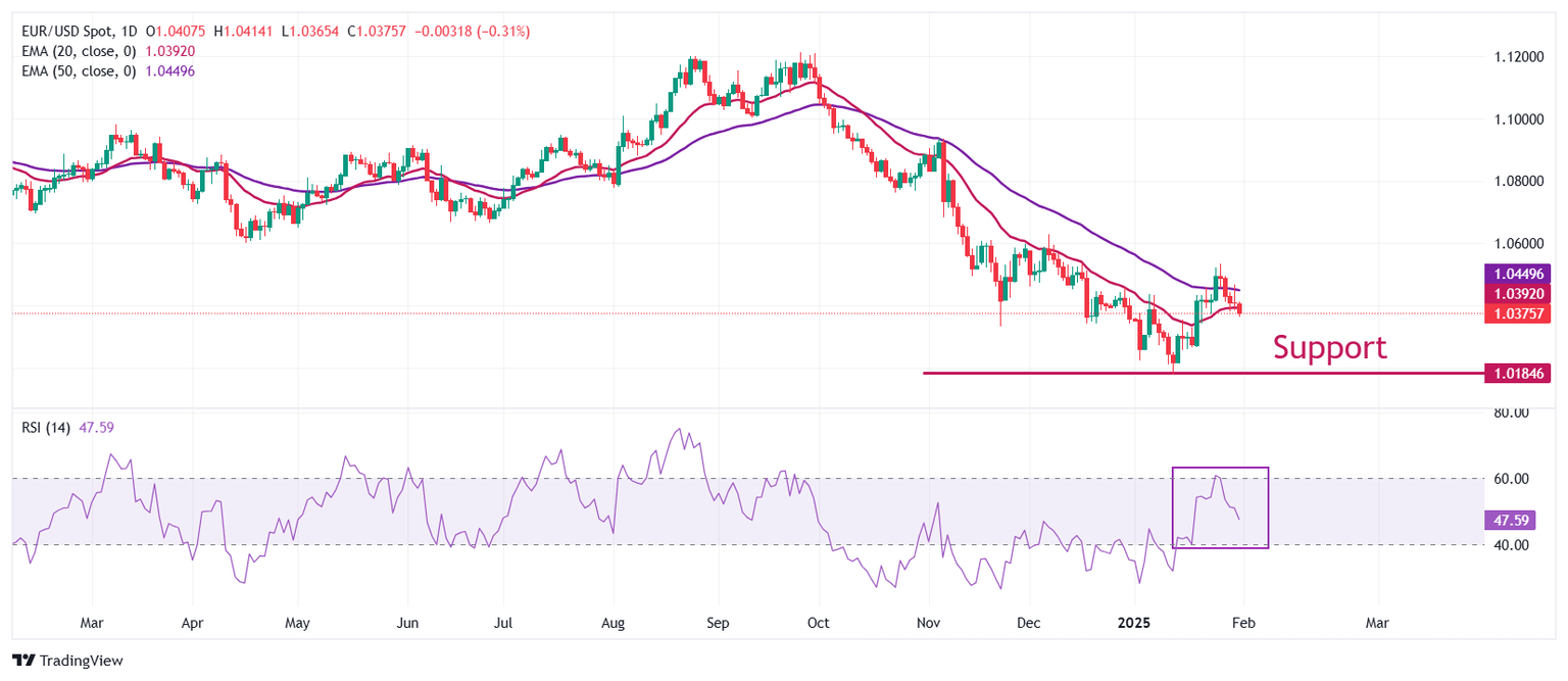 EUR/USD declines to near 1.0370 in North American trading hours on Friday, below the 20-day Exponential Moving Average (EMA) around 1.0390. The major currency pair resumed its correction after failing to sustain above the 50-day EMA, which trades around 1.0449 at the press time.