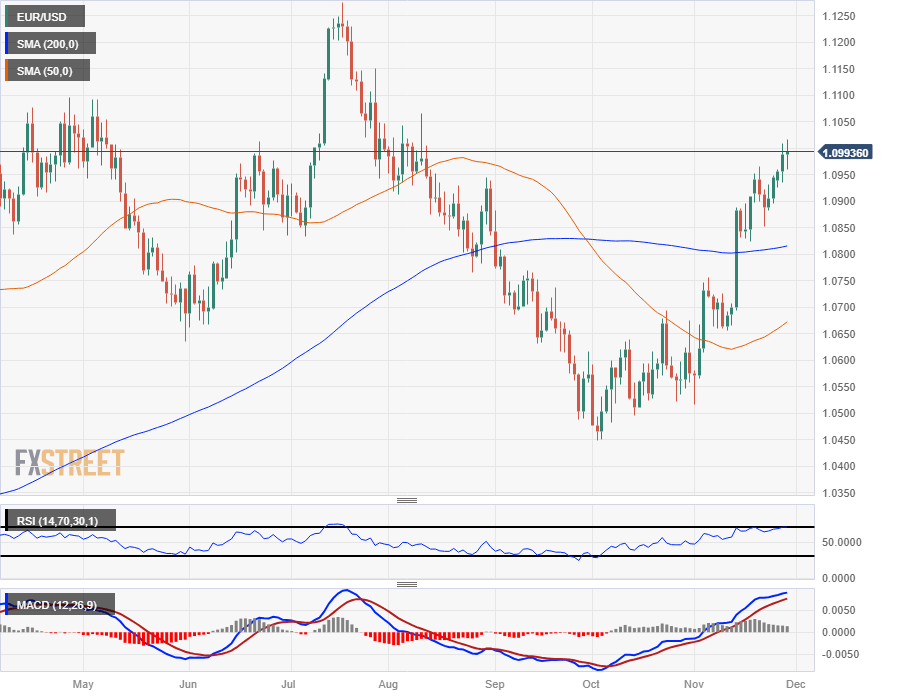The Euro has climbed over 5% against the US Dollar since October's swing low into 1.0450, and the EUR/USD is holding in the green for the year, but 2023's mid-year peak at 1.1275 is weighing on the long-term trend as the pair gets weighed down near 1.1000 with technical indicators leaning into overbought territory.