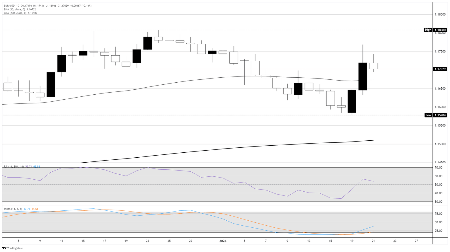 EUR/USD rallied strongly at the start of the week, gaining approximately 1.16 percent across Monday and Tuesday, before giving back around 0.2 percent on Wednesday, according to the current week’s daily candlestick structure. The mid-week pullback appears corrective rather than trend-changing, with the pair consolidating near recent highs rather than retracing the bulk of earlier gains.
