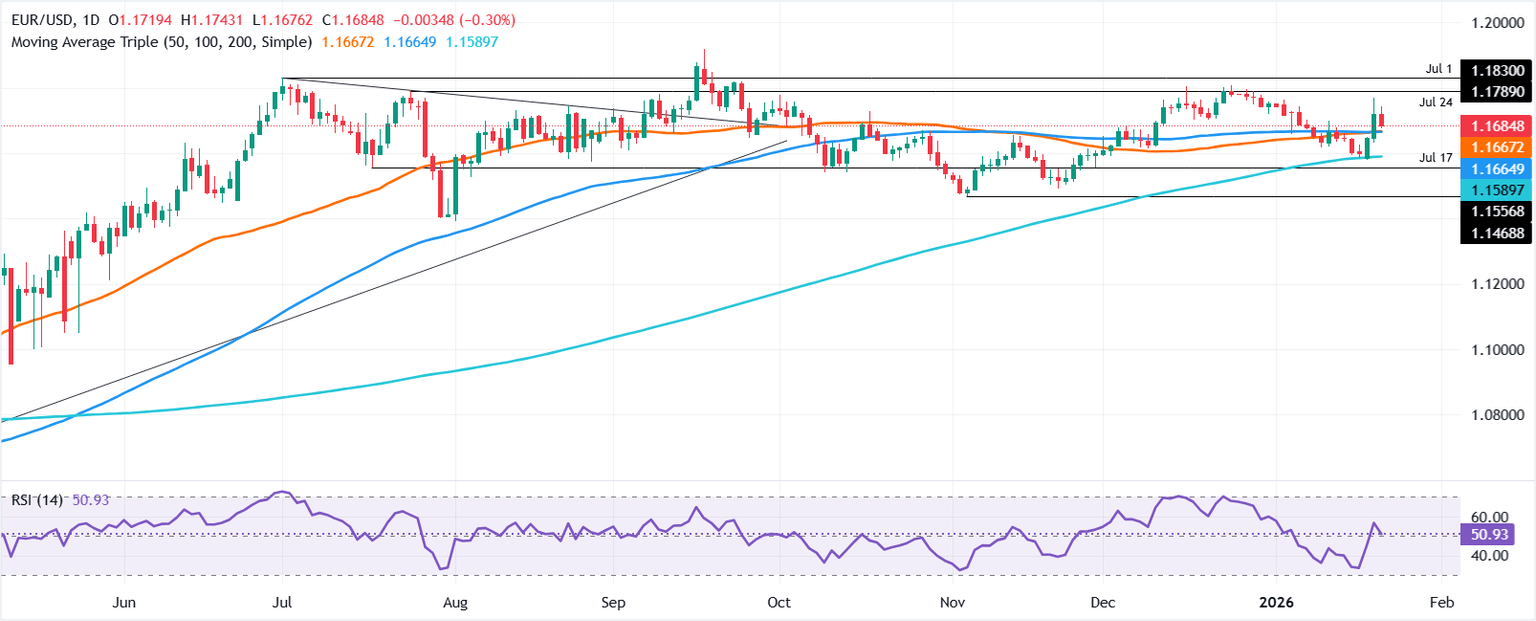 - EUR/USD falls over 0.30% after Trump cancels planned tariffs tied to Greenland negotiations.