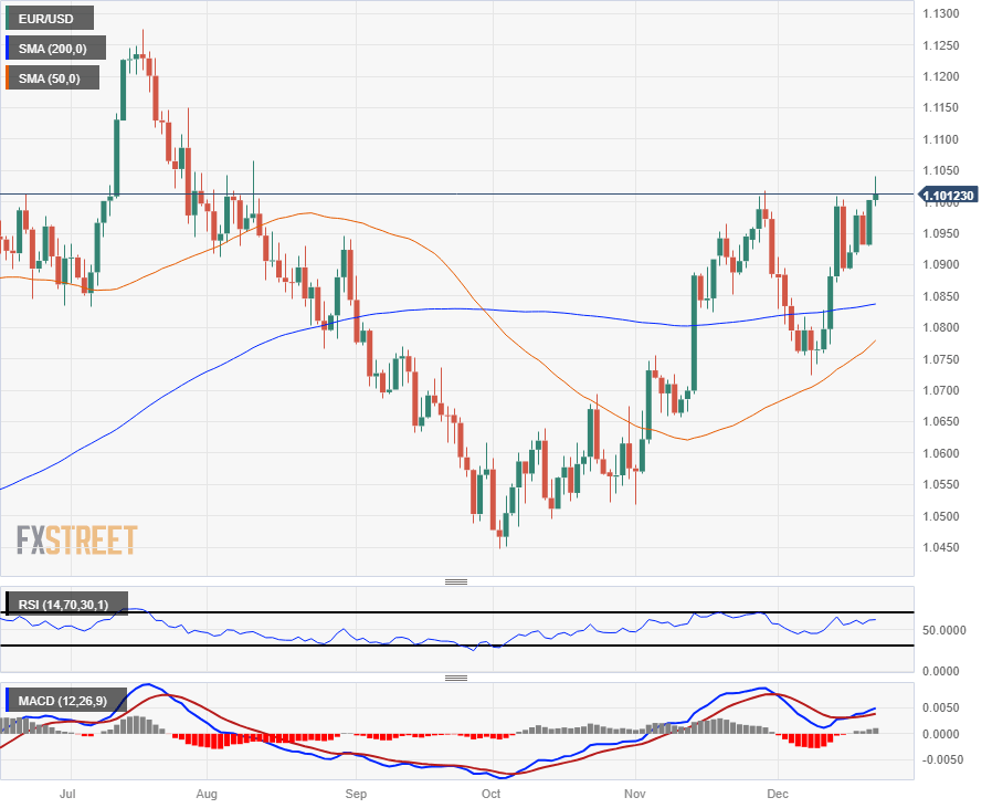 The EUR/USD climbed into an 18-week high at 1.1040 before slipping back towards 1.1000 as markets wind up operations before heading into the holiday break. US inflation missed the mark on Friday, printing below expectations and keeping investor expectations of Federal Reserve (Fed) rate cuts accelerating in 2024.