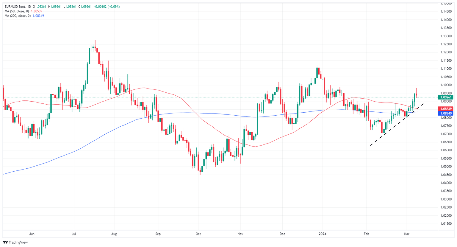 EUR/USD’s late decline on Friday ended a multi-week bull run, with the pair recovering from February’s bottom bids near 1.0700.