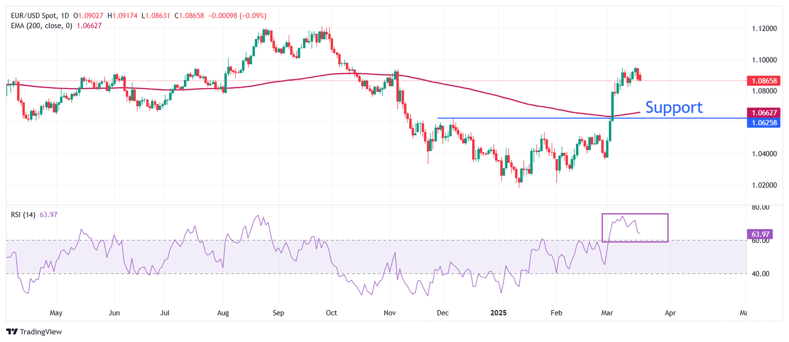 EUR/USD falls to near 1.0830 after failing to hold the key level of 1.0900 on Thursday. However, the long-term outlook of the major currency pair is still bullish as it holds above the 200-day Exponential Moving Average (EMA), which trades around 1.0660.