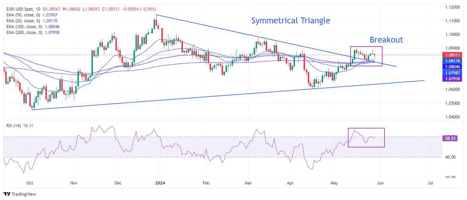 EUR/USD falls to 1.0830 in Wednesday’s New York session after failing to recapture a two-month high near 1.0900 on Tuesday. The near-term outlook of the major currency pair turns uncertain as investors shift focus to the release of the Eurozone preliminary Consumer Price Index (CPI) data for May and the United States (US) core Personal Consumption Expenditure Price Index (PCE) data for April, which will be published on Friday.