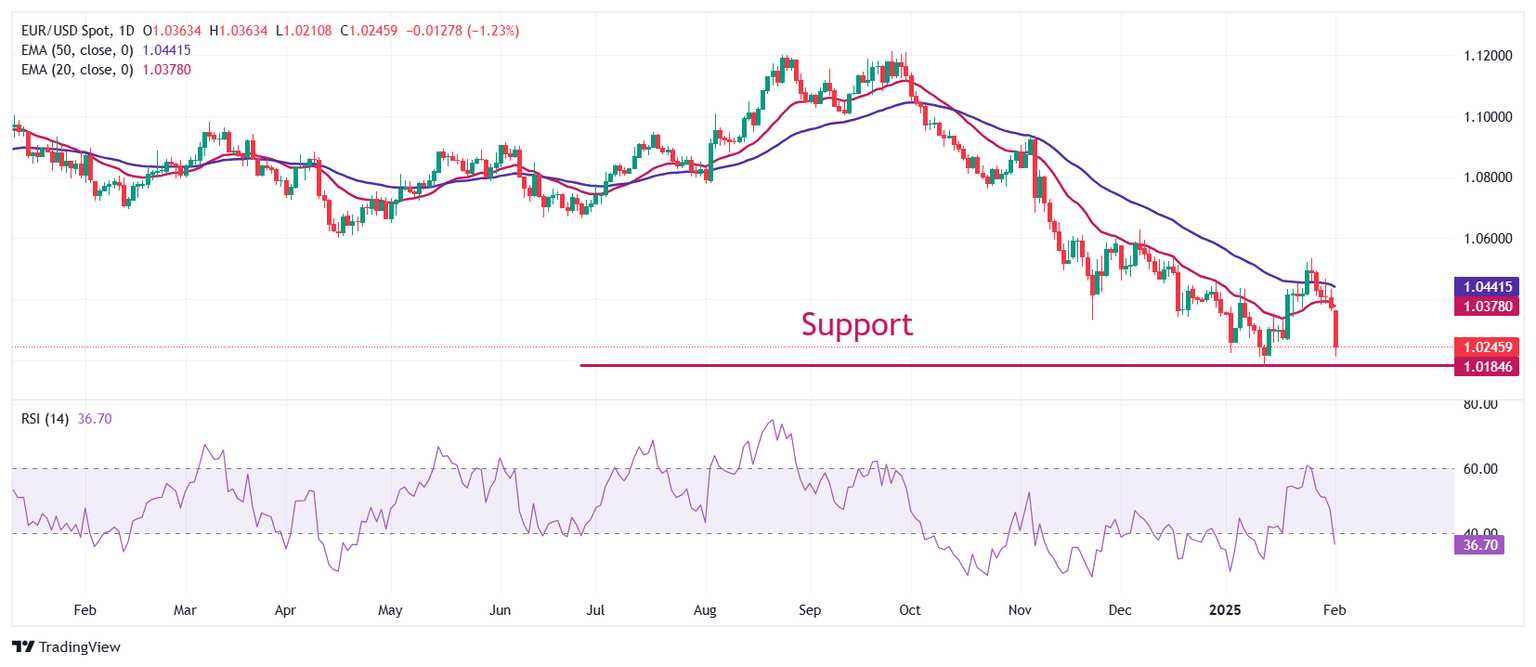 EUR/USD nosedives over 1% to near 1.0240 at the start of the week. The major currency pair plummets as United States (US) President Donald Trump reiterates threats to impose tariffs on the European Union (EU). Over the weekend, Donald Trump slapped 25% tariffs on Canada and Mexico and 10% on China. Trump also warned that he will also raise levies on the trading bloc, but he didn’t provide much information.