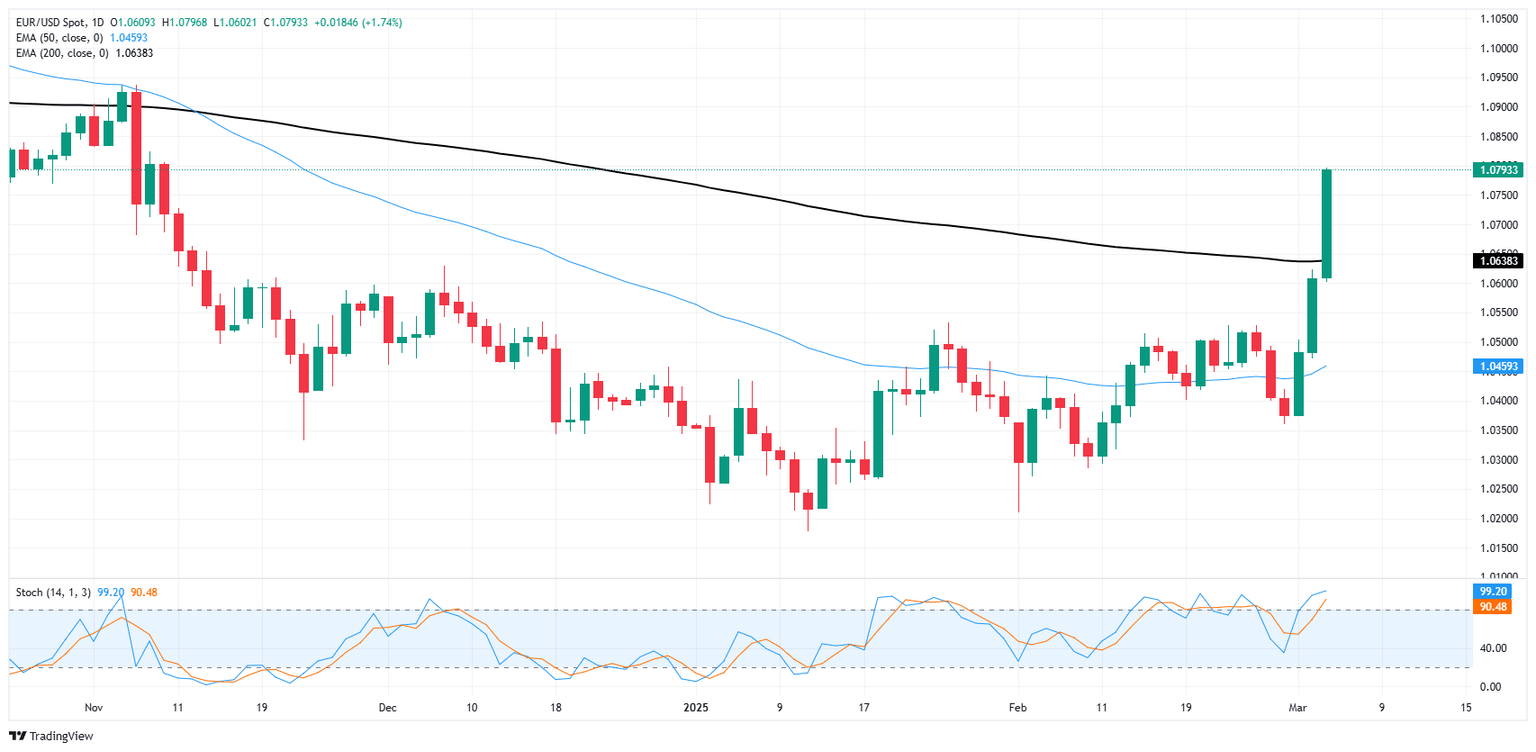 EUR/USD’s Wednesday rally saw Fiber put in its single best trading day in years, rising 185 pips in a single session and rising into touch range of the 1.0800 handle, a price level the pair hasn’t seen since early November 2024. The pair barely noticed the 200-day Exponential Moving Average (EMA) at 1.0640, with EUR/USD crashing through the key moving average on an intraday basis.