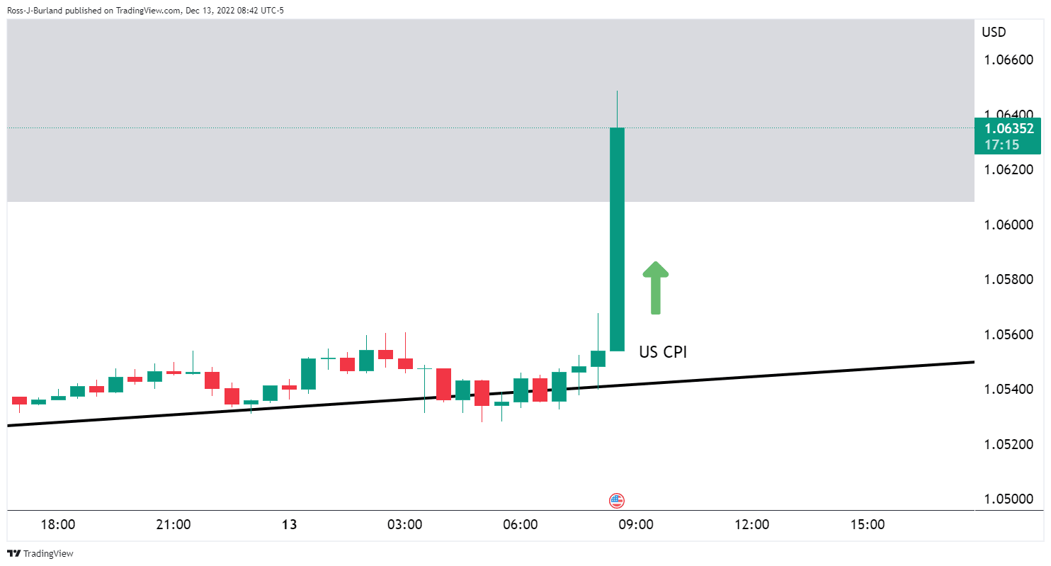 EUR/USD has rallied heavily as the US Consumer Price Index has come in below expectations, leaving the door wide open for a pivot from the Federal Reserve that meets this week to decide on its monetary policy path. At the time of writing, EUR/USD is up on the day by over 1%, with the bulk of its gains coming in a knee-jerk reaction to the US inflation data as illustrated below.