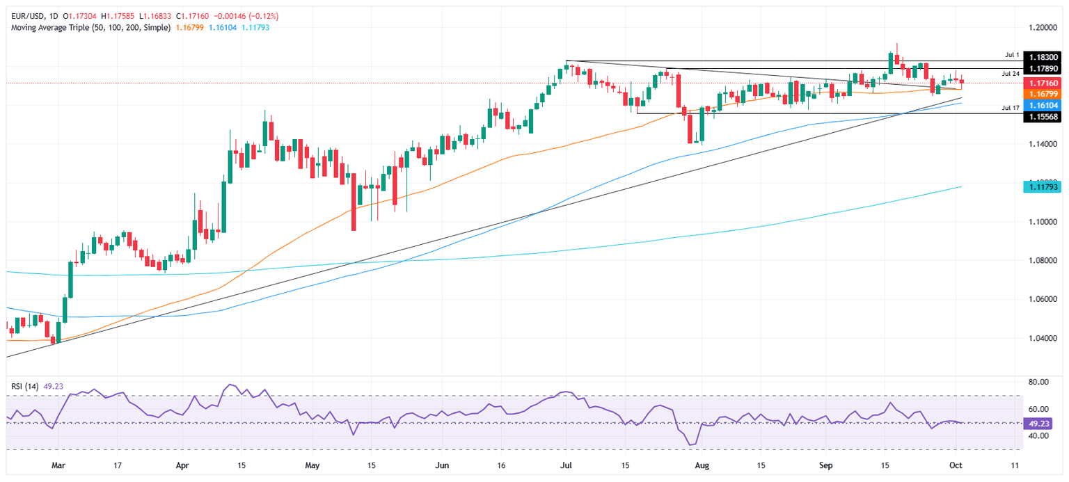 EUR/USD remains steady during the North American session on Thursday, yet registering back-to-back bearish days as the US Dollar strengthens amid the ongoing government shutdown and the absence of US economic data releases like Initial Jobless Claims. The pair trades at 1.1719, down 0.09%.