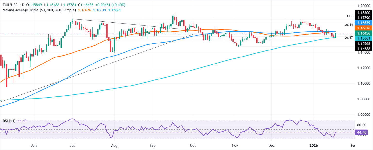 EUR/USD edges higher on Monday up by more than 0.40% as traders ditch the US Dollar as risk appetite deteriorates following Trump’s decision to escalate the US-European Union trade war amid the White House interests over Greenland. The pair trades at 1.1642 after bouncing off daily lows of 1.1576.