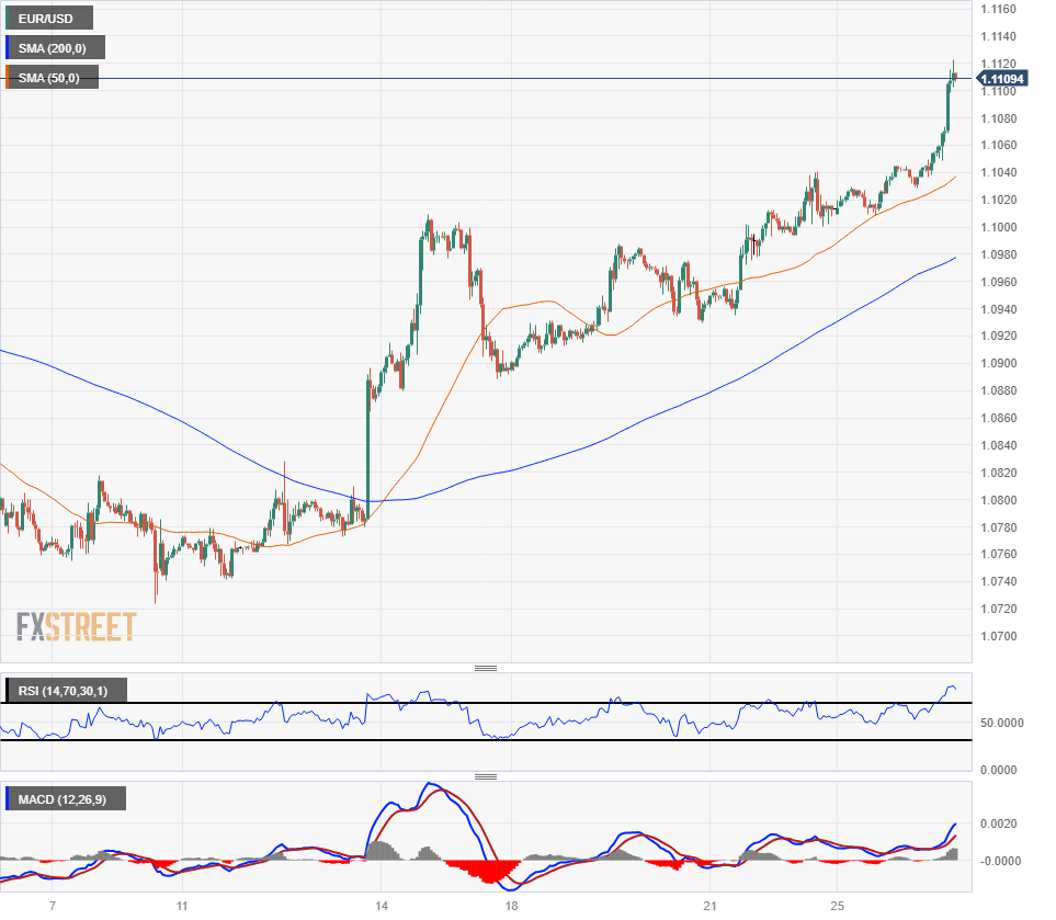 The Euro jumped on Wednesday as broad-market flows pull down the US Dollar, sending the EUR/USD to a near-term high of 1.1120, extending recent bullish action further into the top end with the pair trading well above the 200-hour Simple Moving Average (SMA) near 1.0980.