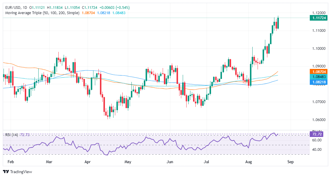 The EUR/USD rallied sharply after hitting a daily low of 1.1105 after Federal Reserve Chairman Jerome Powell said, “The time has come for policy to adjust,” opening the door to ease policy. Therefore, the major jumped toward 1.1170 and posted gains of over 0.54%.