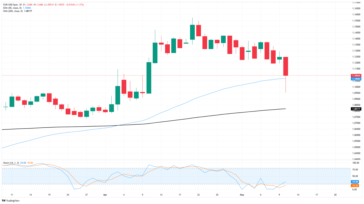 EUR/USD’s fresh bearish plunge on Monday saw the pair test below 1.1000 for the first time since early April. The pair is still trading north of the 50-day Exponential Moving Average (EMA) near 1.1070, but only just.