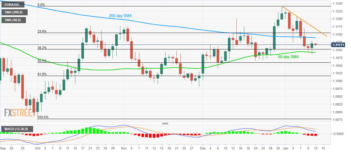 Having bounced off 50-day SMA on Friday, EUR/USD pulls back to 1.1117 during the Asian session on Monday. With this, sellers concentrate on the bearish MACD to aim for a downside break below the mentioned SMA level of 1.1090 for a fresh rule.
