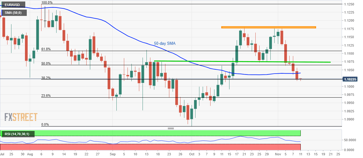 EUR/USD sellers seem taking a hat around 38.2% Fibonacci retracement of August-October downpour as the quote seesaws near 1.1020 by the press time of early Monday.