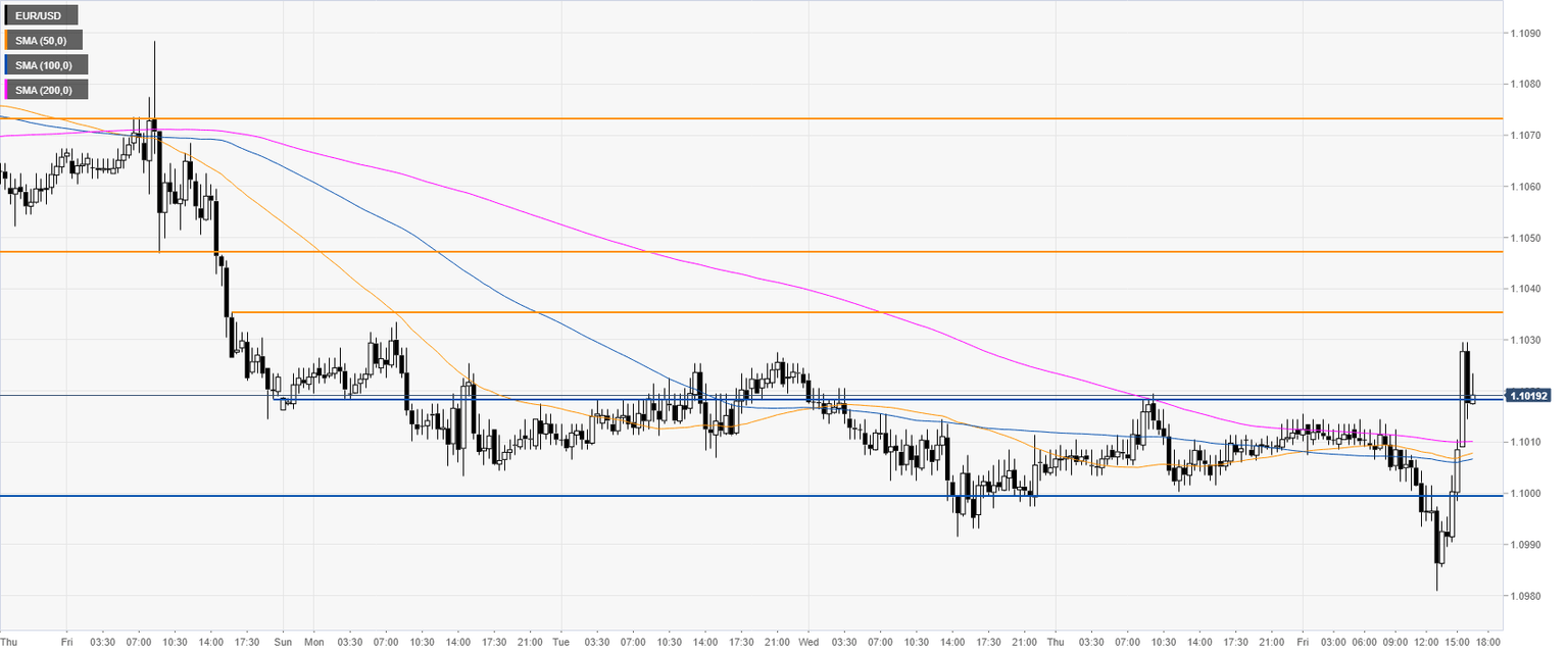 The euro/dollar currency pair, on the daily time frame, is trading in a downtrend below the main daily simple moving averages (DMAs). This Friday, on an intraday basis, the market dropped to six-week lows but the bulls stepped in lifted the pair back above the 1.1000 handle.