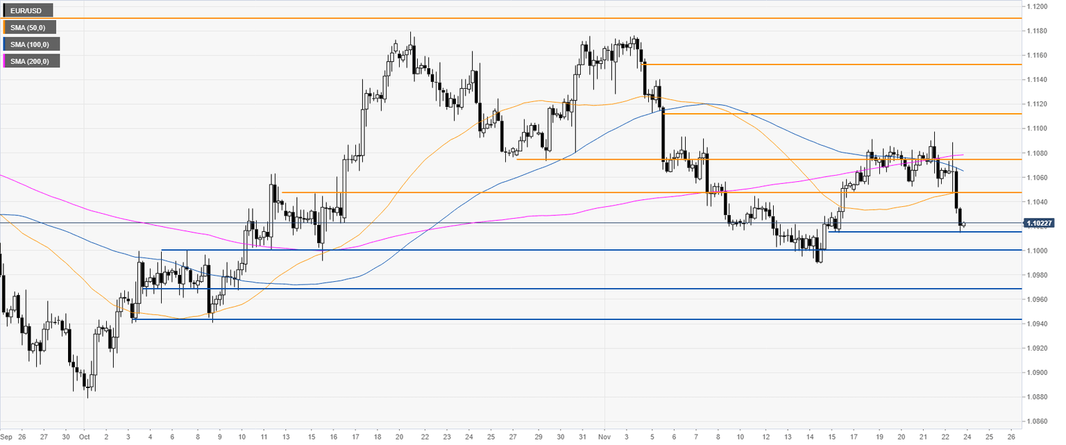 EUR/USD, on the daily chart, is trading in a downtrend below downward sloping 100 and 200-day simple moving averages (DMAs). This Friday, the market hit fresh weekly lows helped by the upbeat US data. The US Markit Manufacturing PMI in November (preliminary) improved to 52.2 vs. 51.5 expected.