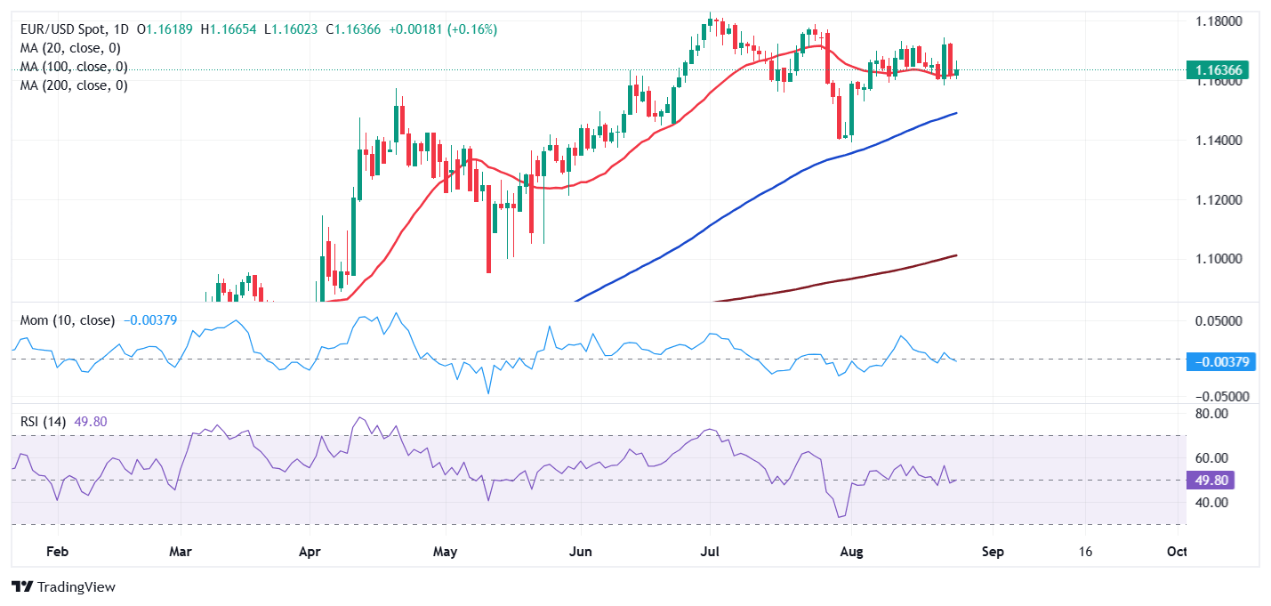 The EUR/USD pair trades within a limited range on Tuesday, holding above the 1.1600 mark but unable to extend gains beyond an intraday peak in the 1.1660 region. The pair is hovering around 1.630 in the American afternoon, lacking a clear bias.
