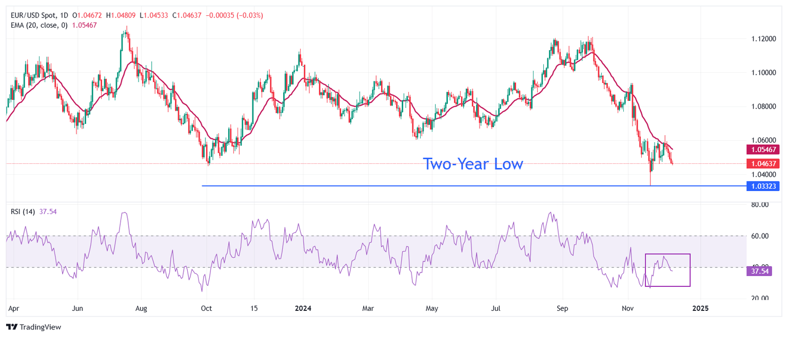 EUR/USD rise to nearly 1.0500 as President Emmanual Macron appointed centrist ally Francois Bayrou as Prime Minister of France, improving hopes of political stability. Macron promised to find a potential PM candidate sooner after Michel Barnier was forced to resign after losing a confidence vote in Parliament. Barnier's government collapsed after the Far Right and left wing showed dissatisfaction over his fiscal budget, which included €60 billion ($62.9 billion) worth of tax hikes. The priority for Bayrou, a close Macron ally, will be passing a special law to roll over the 2024 budget, with a nastier battle over the 2025 legislation looming early next year, according to Reuters.