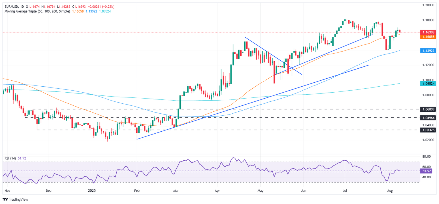 The EUR/USD trades at 1.1648, down 0.14% daily, as market mood is upbeat due to the chance that the Ukraine-Russia war could end. News of a possible Trump-Putin meeting next week leads some to expect a deal that could halt hostilities in Ukraine.