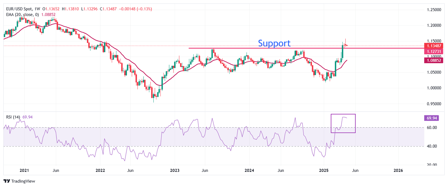 EUR/USD trades back-and-forth around 1.1350 in Monday’s European session. The outlook of the major currency pair remains bullish as the 20-week Exponential Moving Average (EMA) is sloping higher around 1.0885.