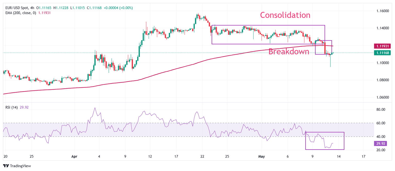 EUR/USD gains temporary ground below 1.1100 on Tuesday after a sharp sell-off the previous day. The pair plunged on Monday after a breakdown of the 1.1200-1.1440 range formed in the prior 20 trading days. The major currency pair extends its downside move below the 200-period Exponential Moving Average (EMA), which is around 1.1200, indicating a bearish trend.