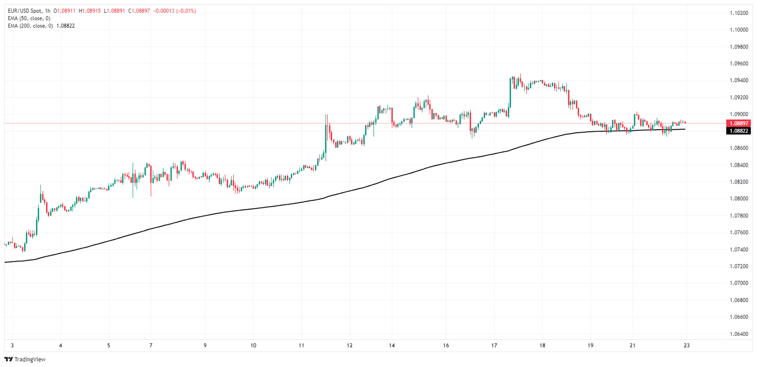 EUR/USD traded tightly with near-term technical levels on Monday, cycling just north of the 200-hour Exponential Moving Average (EMA) at 1.0882. The Fiber has pulled back from recent highs set just shy of 1.0950 as Greenback bidding eases further back but the top end remains close by.