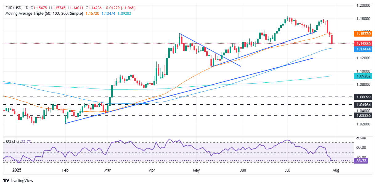 EUR/USD dropped below 1.1500, extending its losses toward 1.1400 near the 100-day Simple Moving Average (SMA) of 1.1355. The Relative Strength Index (RSI) shows that sellers are in charge, after diving from around 40 to 34.60. This suggests that further downside on the pair is seen.