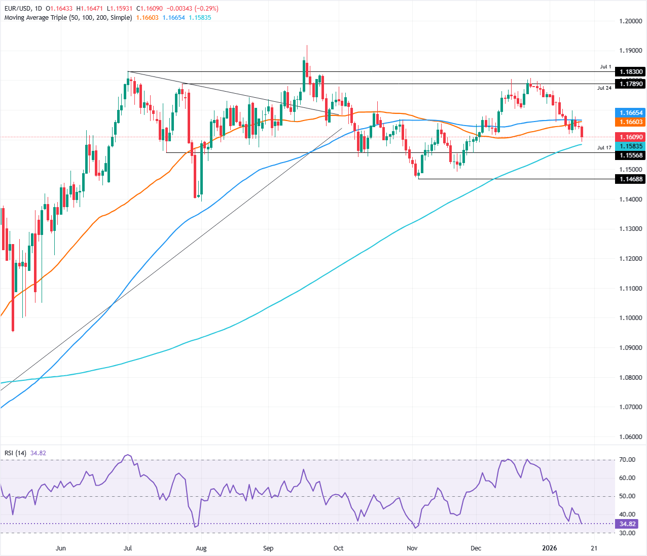 EUR/USD consolidates, yet it briefly cleared 1.1600 to hit a year to date (YTD) low of 1.1593, before recovering the 1.1600 figure. Momentum continues to favor sellers as depicted by the Relative Strength Index (RSI), which stays below its neutral 50 level, signaling that bears retain the upper hand.