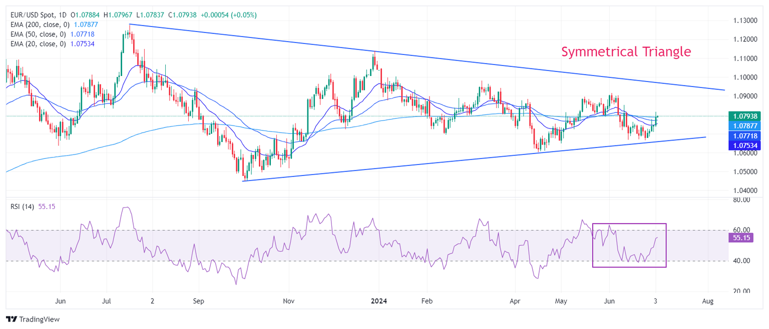 - EUR/USD gains to near 1.0800 ahead of the second round of legislative elections in the Eurozone’s second-largest economy, France, on Sunday. After suffering a defeat by the Marine Le Pen-led-far right National Rally party, a coalition by the Central Alliance led by French President Emmanuel Macron and the left wing moved to a tactical withdrawal of at least 200 candidates from Sunday’s parliamentary elections in an attempt to thwart the far right from gaining an absolute majority.
