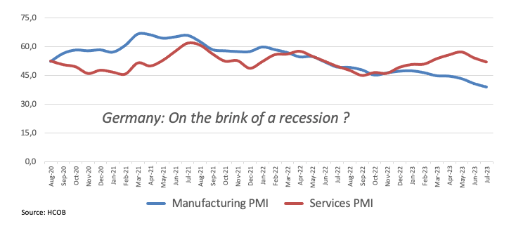 The drop in the pair's value is driven by the disappointing reports of preliminary Manufacturing and Services PMIs in Germany and the wider eurozone for July along with rising market chatter that a recession might by in the offing in the region.