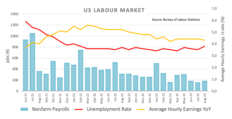 - US Nonfarm Payrolls surprised to the upside at 187K jobs in August.