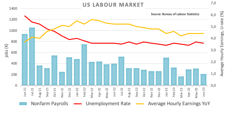 Across the Atlantic, Nonfarm Payrolls showed the US economy added 209K jobs in June, while the Unemployment Rate eased to 3.6% in the same period. In addition, Average Hourly Earnings - a proxy for wage inflation - rose 0.4% MoM and 4.4% from a year earlier, and the Participation Rate held steady at 62.6%.