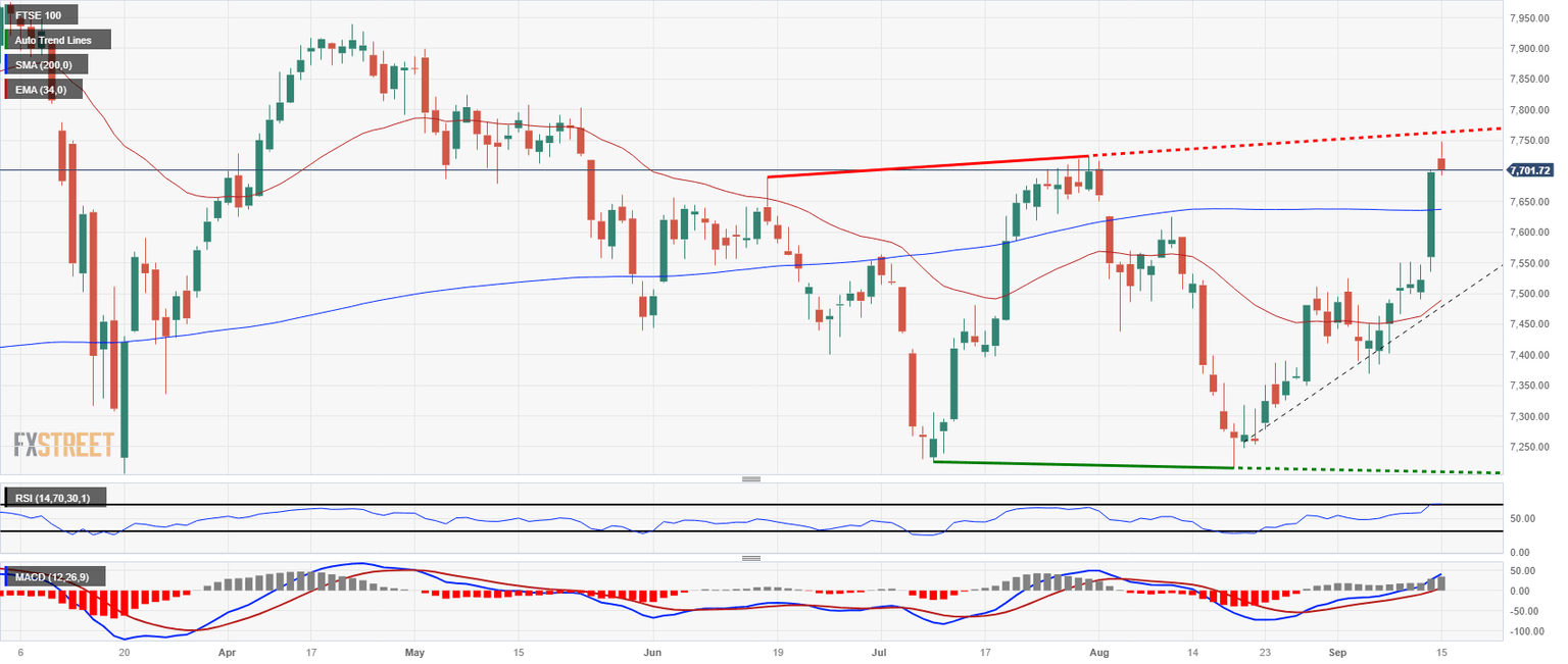 Bidders will note the Relative Strength Index (RSI) is moving into overbought territory, and another leg higher might need to wait for a pullback and the 34-day Exponential Moving Average (EMA) to gather further steam from the £7,500 handle.
