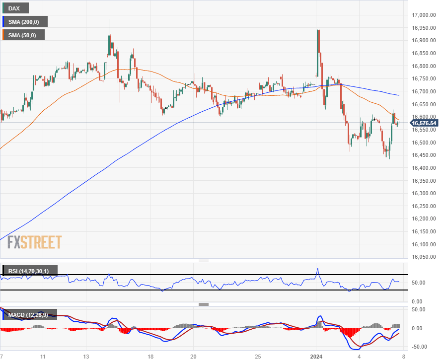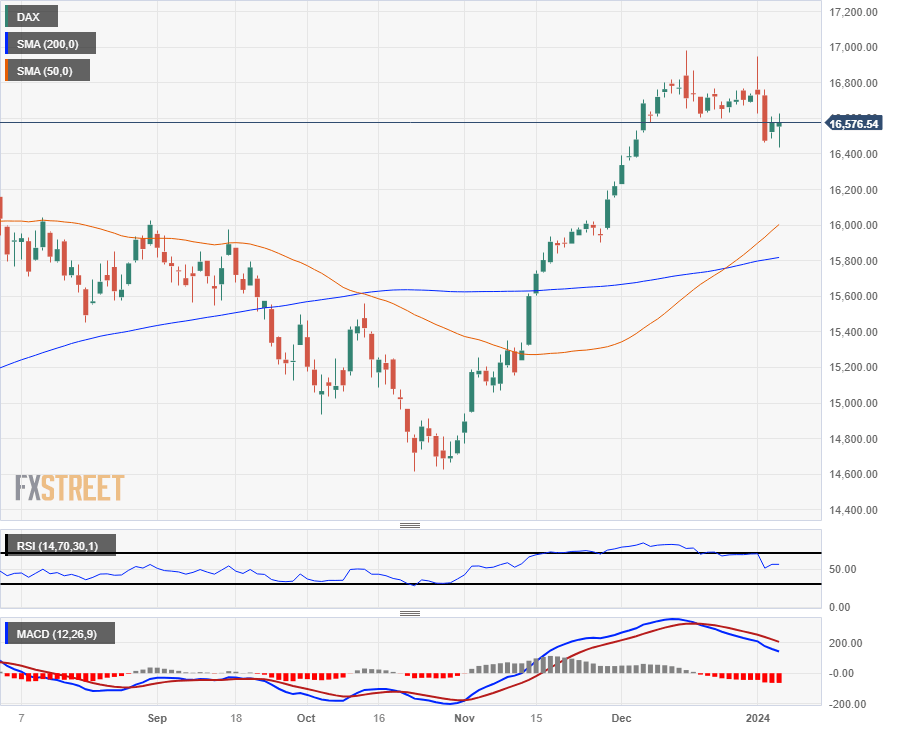 The DAX kicked off 2024 with an early rally into €16,950 as investors keep an eye turned to the major 17,000 handle, but the equity index continues to get dragged below the 200-hour Simple Moving Average (SMA) near €16,700.