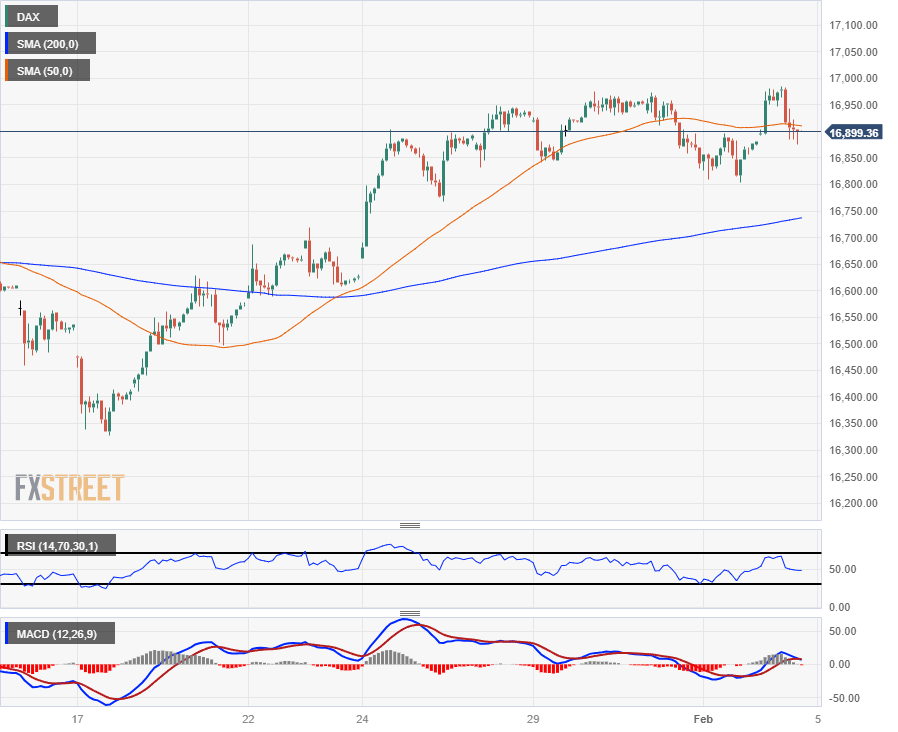 The DAX ended the week in the green, gaining a leg higher on Friday, but the major equity index saw another failed run at the €17,000.00 major handle. Near-term technical support sits at the 200-hour Simple Moving Average (SMA) near €16,750.00.