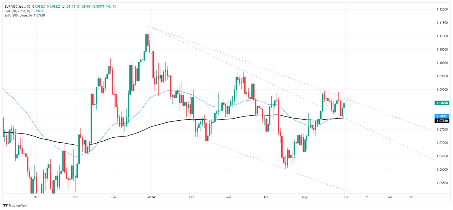 EUR/USD struggled to make headway on Friday, splashing around near 1.0850 as the major pair heads into the close within reach of the week’s opening bids on Monday. European Harmonized Index of Consumer Prices (HICP) inflation rose faster than expected in May, while US Personal Consumption Expenditures (PCE) Price Index inflation cooled faster than expected in April. Next week brings a heavy data docket, with Purchasing Managers Index (PMI) figures on both sides of the Atlantic followed by an anticipated rate call from the European Central Bank (ECB) and another print of US Nonfarm Payrolls (NFP) next Friday.